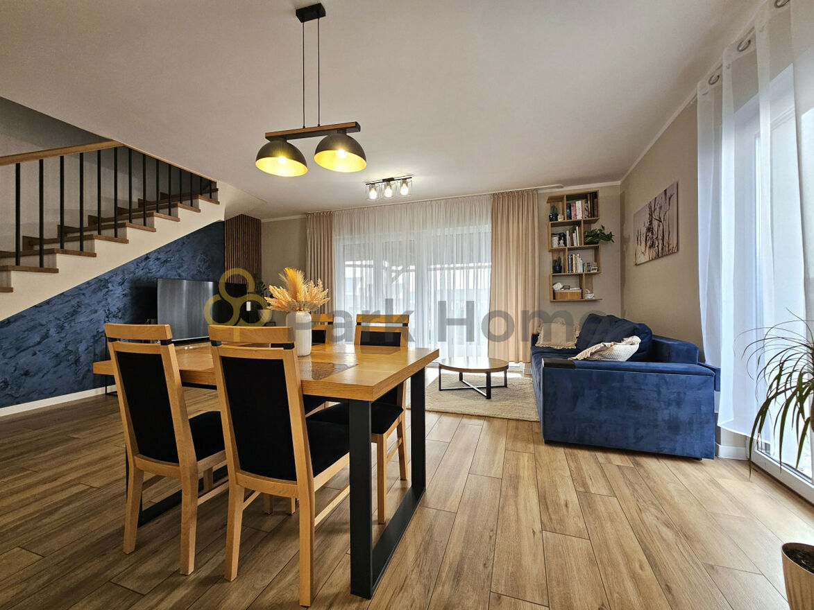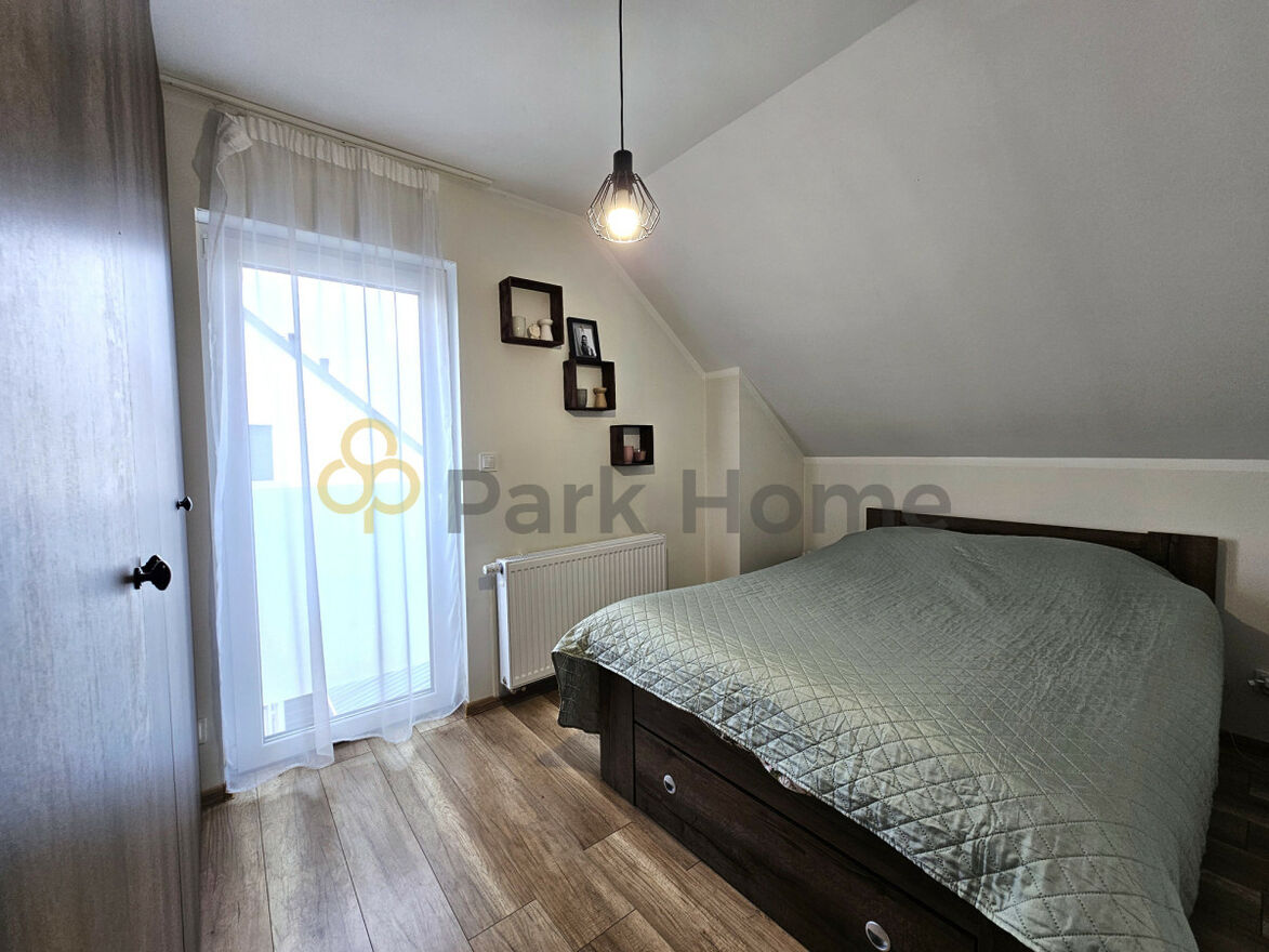 Strefa dzienna na parterze to przestronny salon z aneksem kuchennym, WC i komunikacja. Na piętrze mieszczą się 2 sypialnie oraz ustawna łazienka z wanną i z prysznicem.